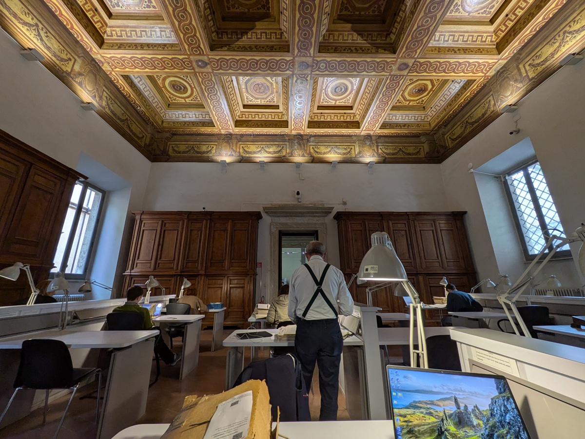 It is not possible to take photographs in the archive, although you can order reproductions of material (albeit at quite a steep price). The limit on the number of items that can be ordered per day means that it is important to prioritise and be selective. The archive is open for the whole day only on Mondays and Tuesdays (it is a half day for the rest of the week). In addition to the index and consultation rooms, there are two additional rooms on the level below that contain printed reference works and are where digitised materials can be viewed. In addition to the café in the Cortile, there are vending machines selling drinks and snacks near the toilets. There is no wi-fi.