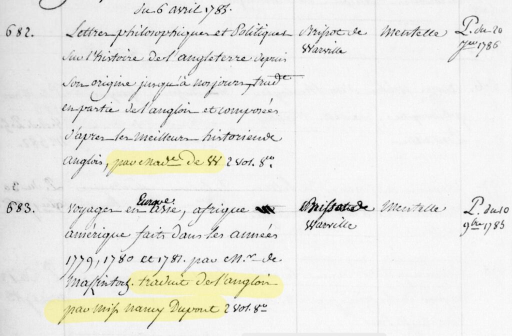 In April 1785, Voyages was registered with the guild and subsequently issued with a permission tacite (tacit permission), allowing it to be published and distributed. As part of the registration process, the book’s translator was named. Here, the register took me by surprise: not only was the translation not Brissot’s, it was not Félicité’s either. The real translator was, in fact, Félicité’s teenage sister, Marie-Anne, known in the family as Nancy.